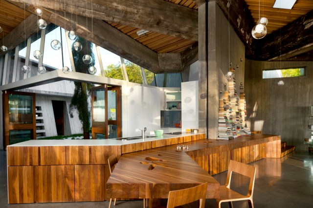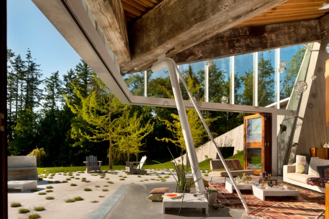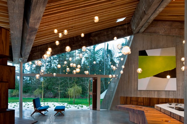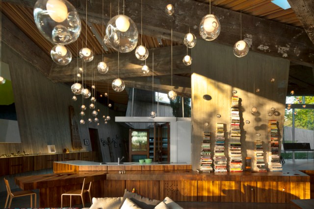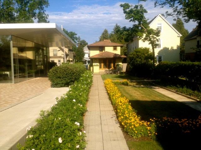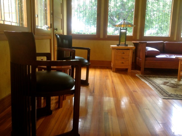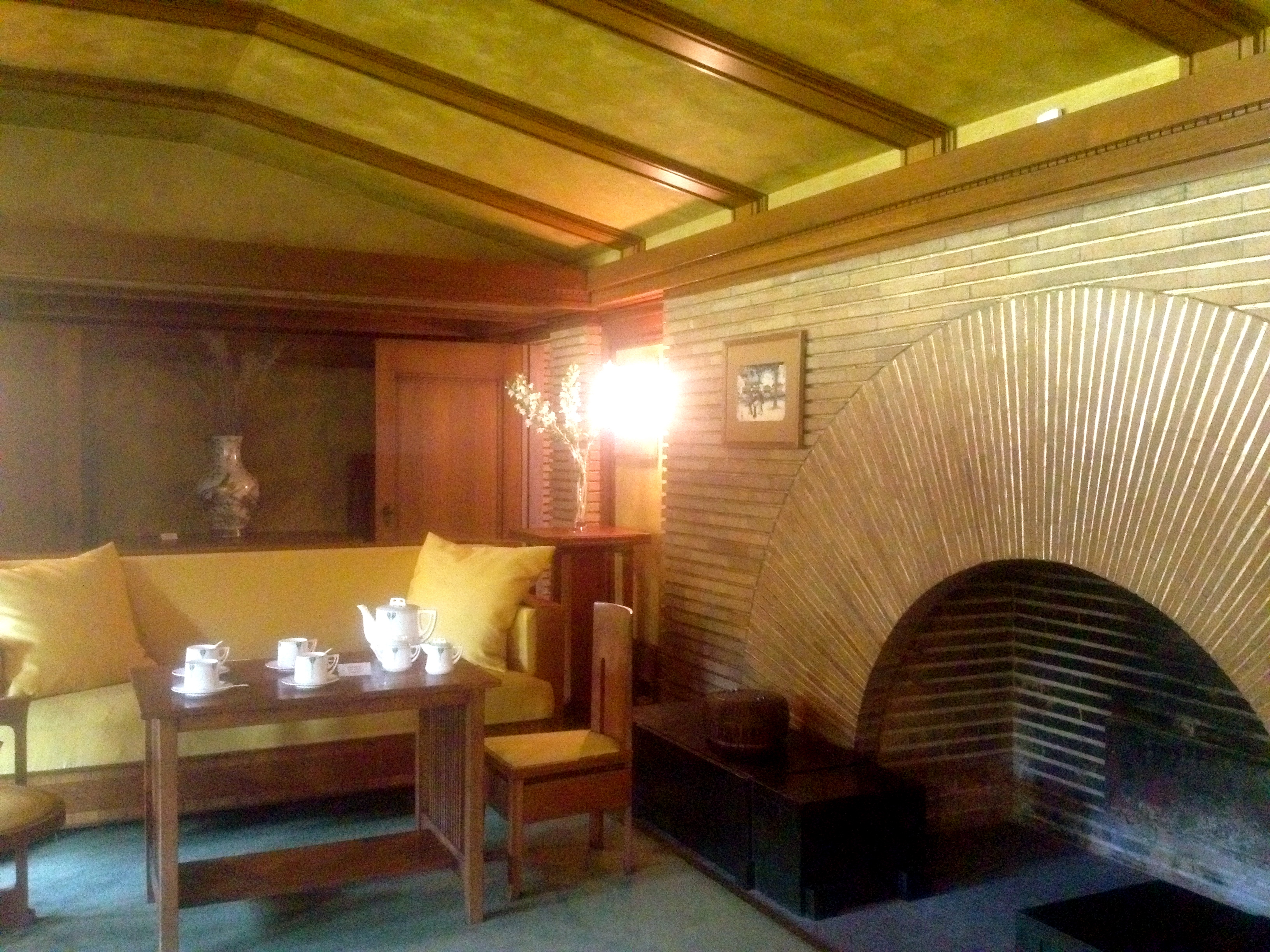 Class difference: this is not the Gardener’s Cottage, but the reception room of the main Martin House. The sunburst fireplace with bronze gilding in the mortar joints between the bricks was intended to warm the heart, though the Martin House fell into ruin after the Depression and is only now undergoing a massive and impressive restoration. If you’ve been to Wright’s Fallingwater, seek out the Martin complex next.