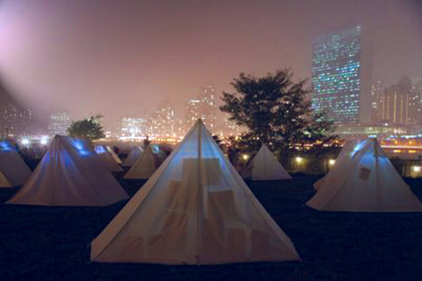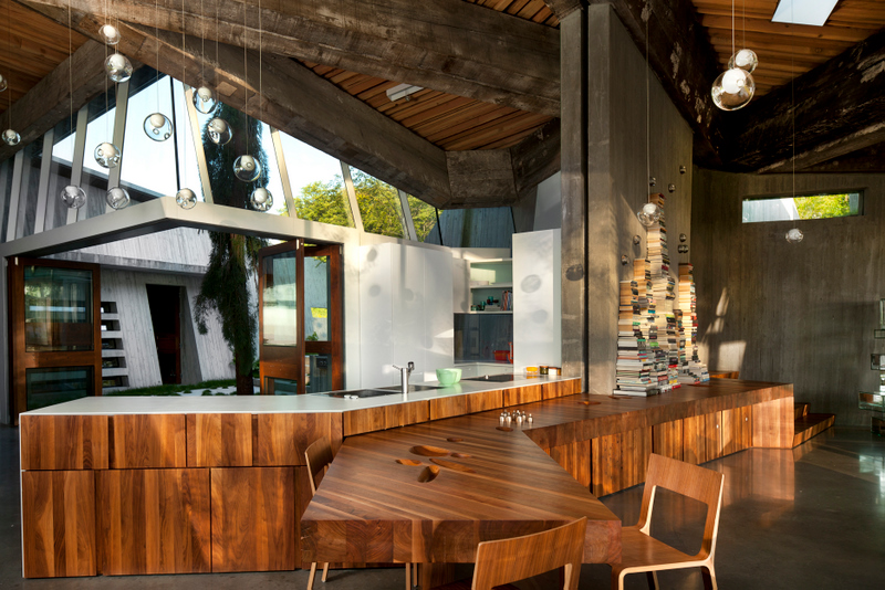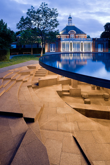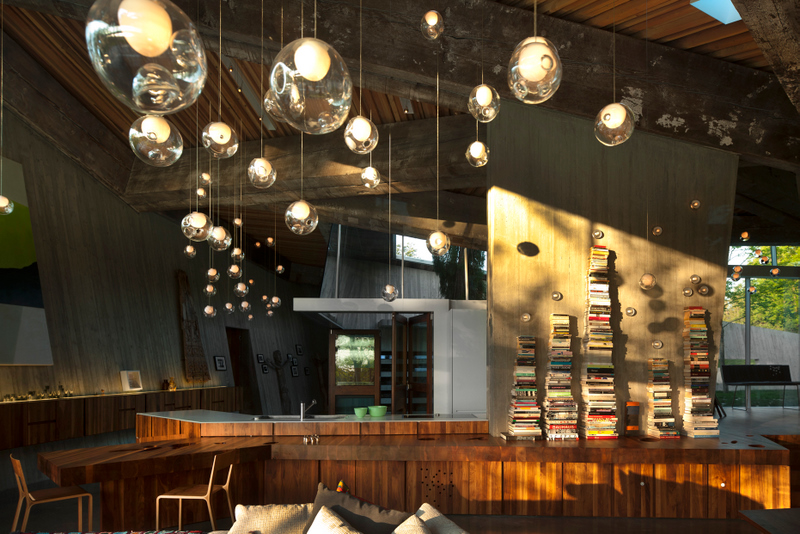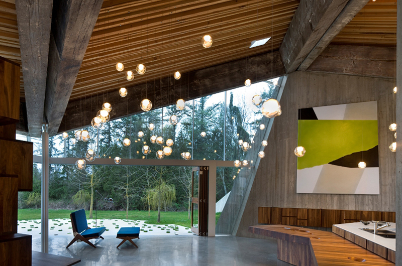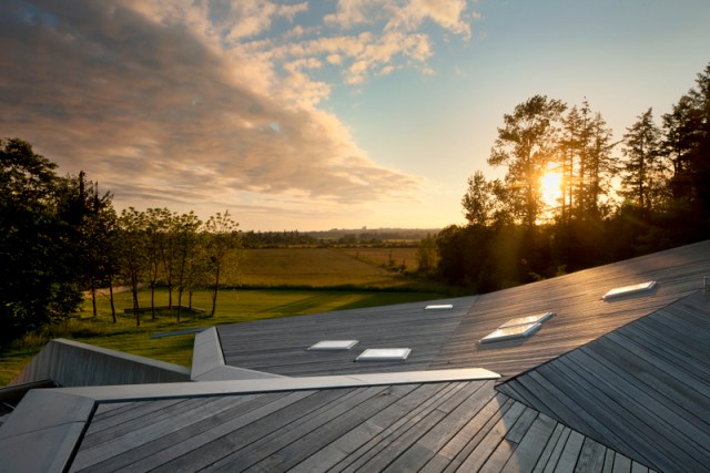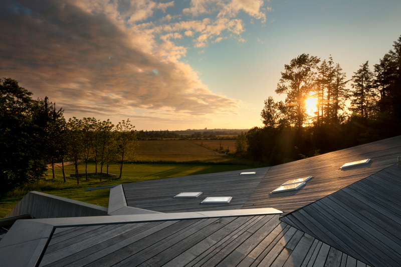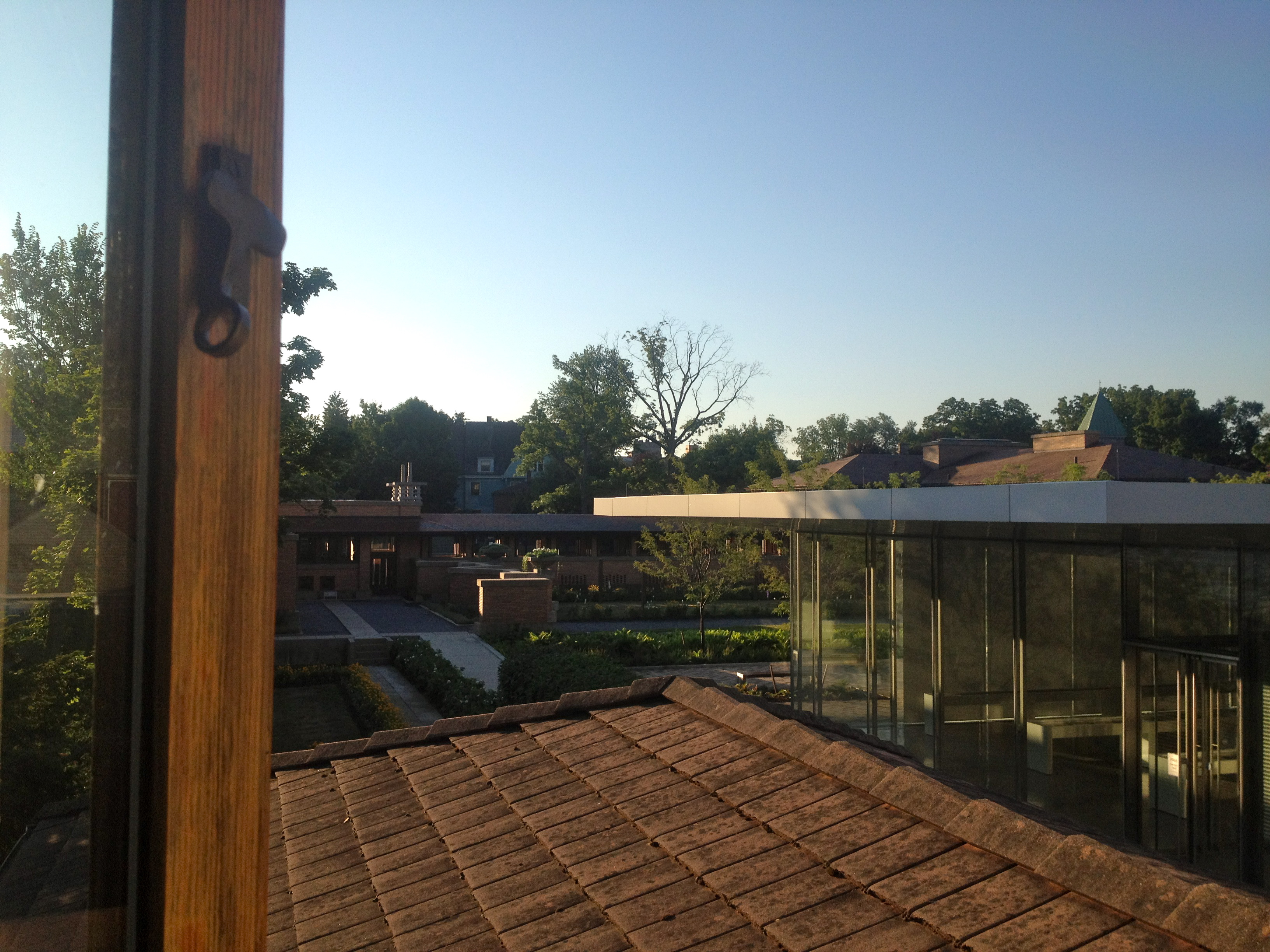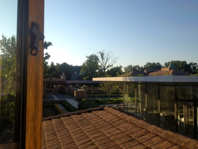 Morning time view from the Gardeners’ Cottage, across the terra cotta rooftop, to the Greatbatch Pavilion, a visitor centre, intelligently designed as a piece of luminous architecture by American architect Toshiko Mori. Mori was intrigued by the sheltering eaves of the prairie-style architecture, and inverted Wright’s low-slung hip roof for the visitor centre so that the interior ceiling dips down toward the exhibition space.