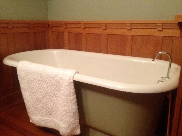 Wright specified miles of rift cut white oak and Roman brick for the main Martin House. But, for the nearby Gardener’s Cottage, materials were simplified: wainscoting in cypress and broad brush stucco. Sage green…because Wright advocated going to the woods and the fields for colour schemes.