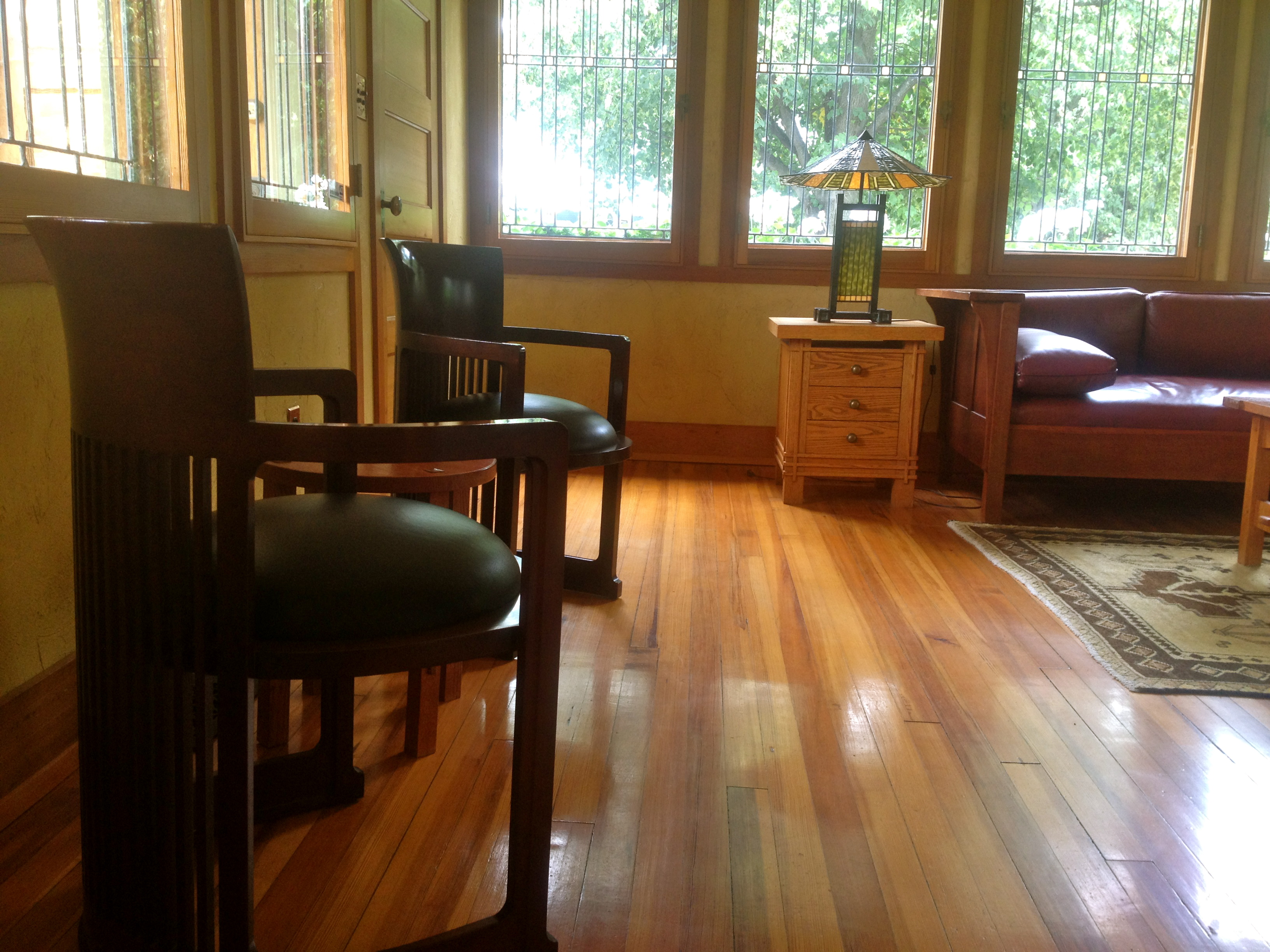 Wright was intrigued by the absence of light and shadowy interiors. But the two-storey cottage is filled with light pouring in from generous wood-framed windows that line the walls of the bedroom and the living room. Wright’s Barrel chairs, designed specifically for the Martin House, super comfortable. The couch not so much. The bed fantastic.