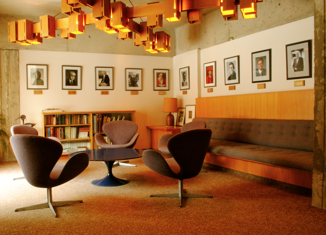 An archival photo of one of the Trent lounges, graced by Jacobsen Swan chairs around an Eero Saarinen table. Built-in furniture and modular wood chandelier by Canadian great, Ron Thom.