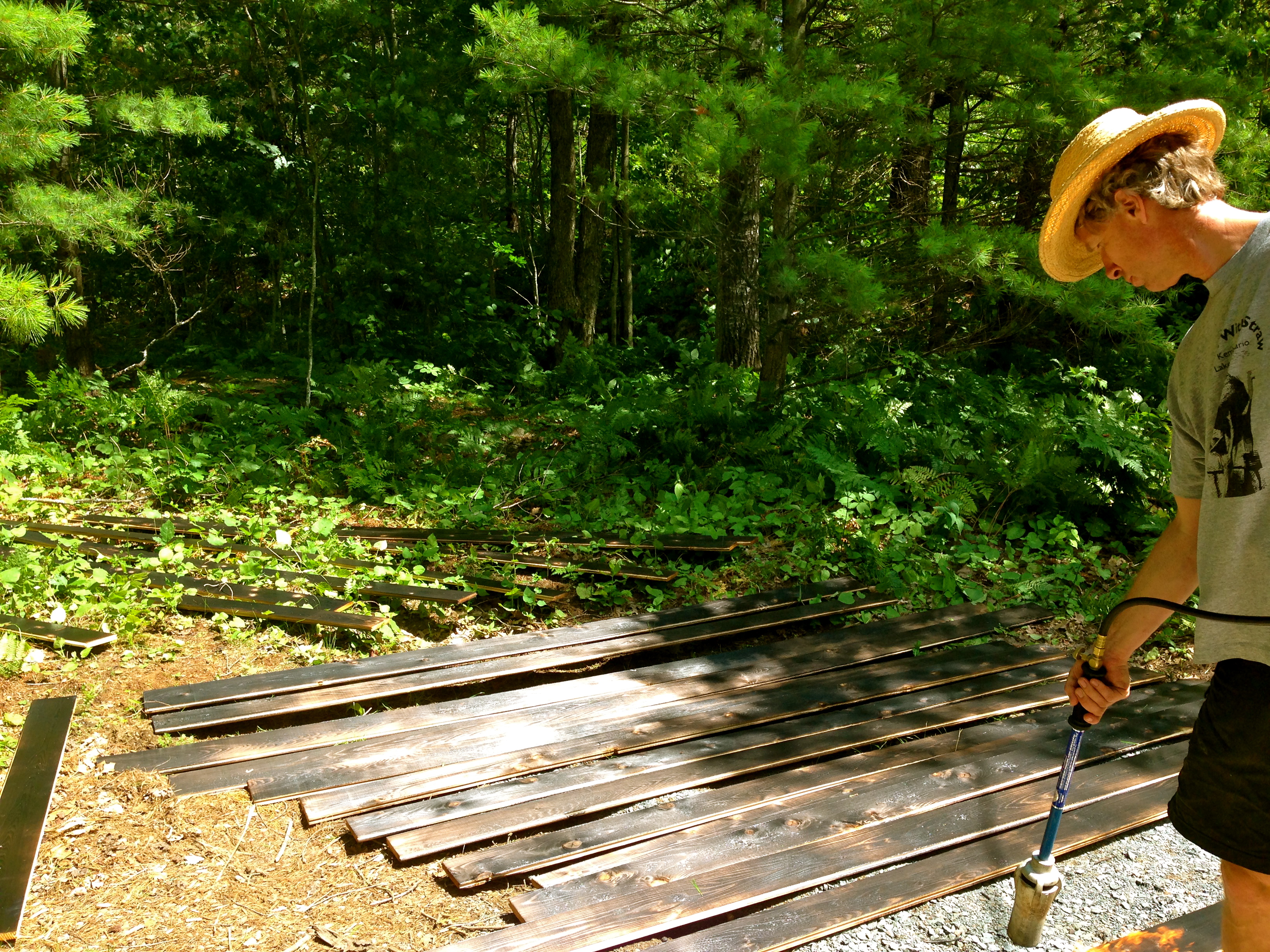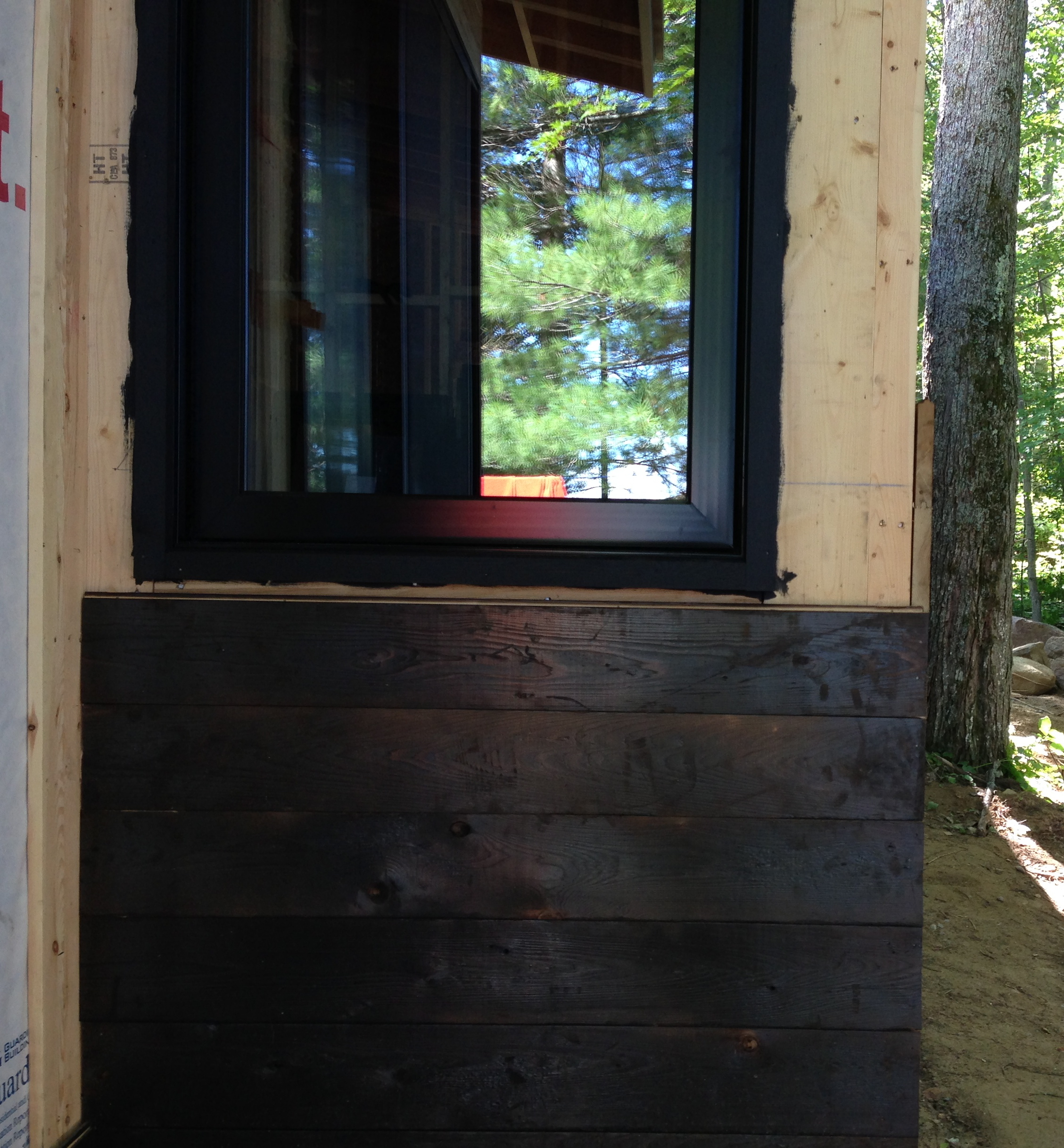 Call us crazy (we were) to burn wood on purpose. Luckily, our excellent contractor (Brinkman Construction) was game. He supplied us with a massive propane torch typically used to melt ice on roads, and we char-tested Western Red Cedar and Eastern. The Eastern, primarily because it’s local and readily available, won out. We laid out about 12 boards at a time and went to work. It’s very intense and best done in pairs: one person working the torch, the other ready with a wet brush and pail of water to control wandering licks of fire.