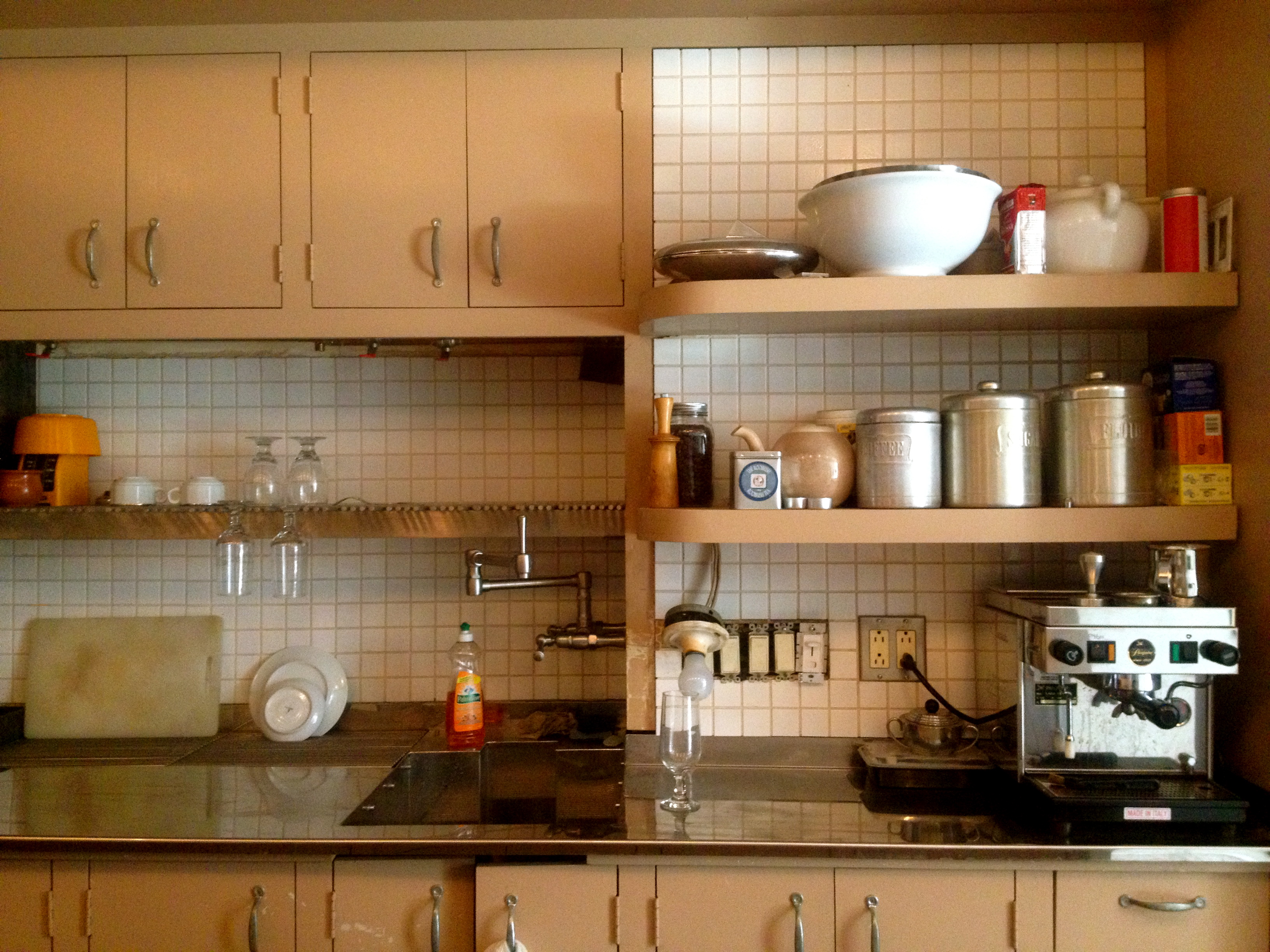 For any custom built-ins or shelving we’re using Baltic birch ply. It’s light and creamy next to the golden cedar interior of the original 1960s cottage. Our coffee bar, pictured here, just getting set up now with Danish teak chest from Kensington Market, yellow Italian espresso maker from my friend, Ginetta, and pastel-coloured melamine dishes.