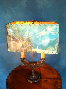 For a quiet retreat, without having to drive north, there’s always the canadiana fireside room…a round cedar table with rough hewn legs, likely from the 1950s and retrieved from our first family cottage on Georgian Bay; and this vintage lamp with lake louise mountainscape and classic log house, which always makes me smile.