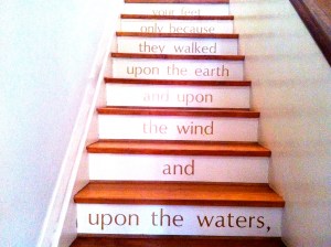 “…But I love your feet only because they walked upon the earth and upon the wind and upon the waters, until they found me.” Tracing this poem by the great Chilean poet Pablo Neruda on our front hall stairs was one of the first things I did when we moved into our home in the Beaches. Everybody from the couriers to kids at Hallowe’en like to stand in the hallway and read it out loud. One of my best anniversary gifts to my (gorgeous) husband.